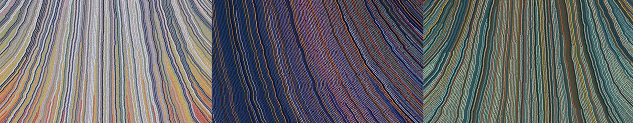 Tony created the artwork by writing a JavaScript algorithm that mimics shell growth. From a simple row of points, the subsequent rows grow outward from the centre. Then, when gaps appear between points, the program adds new points to fill them. The linear structure we see are the paths that connect these points, with colour mapping the age of each path.